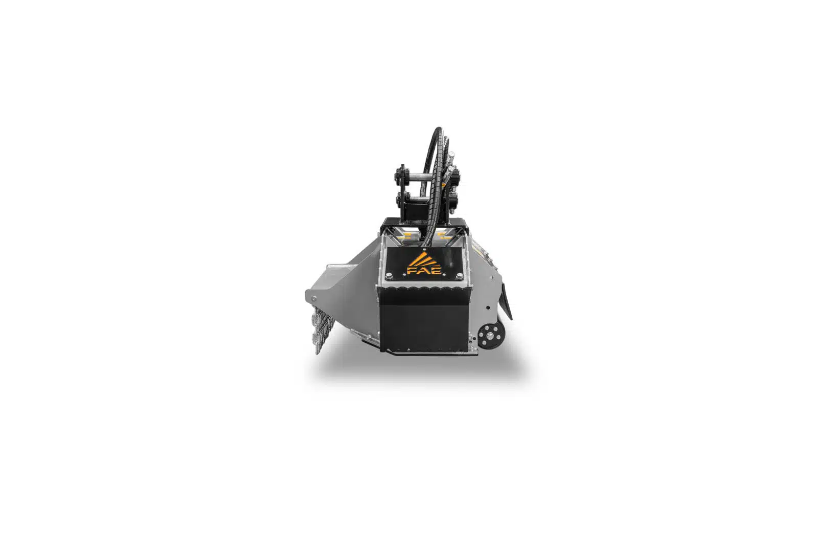 Compact mulcher with a rotor featuring moving hammers, ideal for hydraulic excavators.