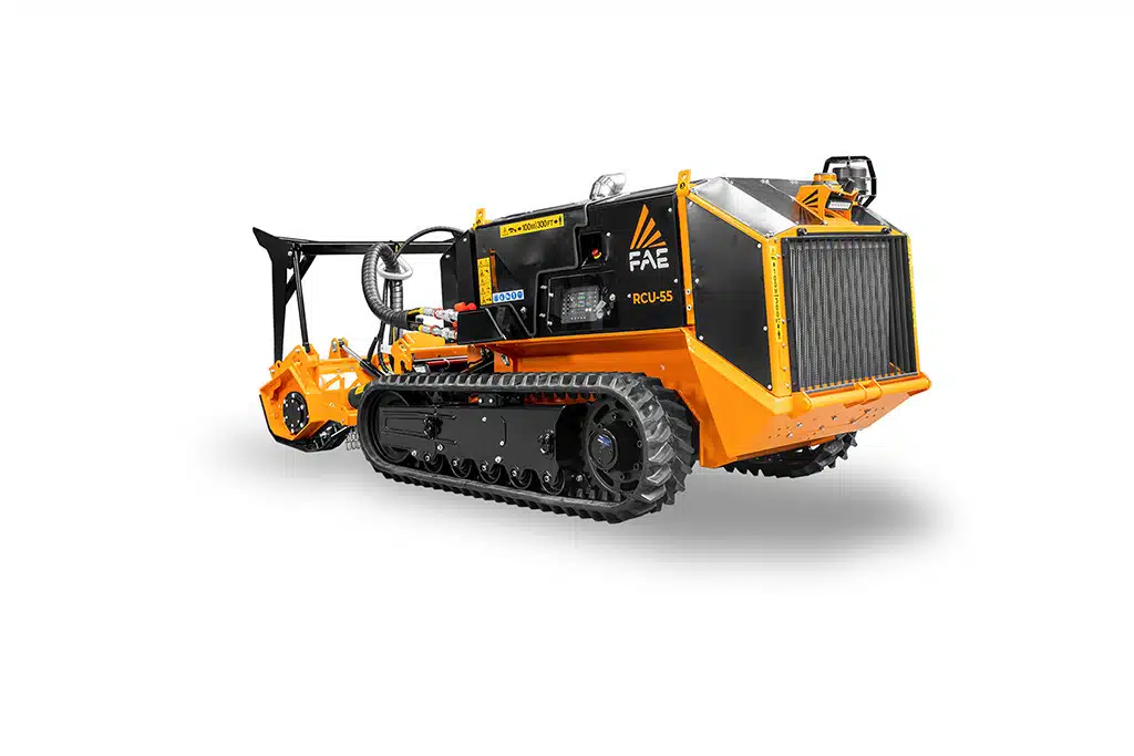 The RCU55, Stage V version, is a compact FAE crawler carrier engineered to efficiently shred branches, wood, grass, small shrubs, and stumps thanks to its versatile attachments. This model combines robustness, maneuverability, and power, making it ideal for the most demanding terrains.
