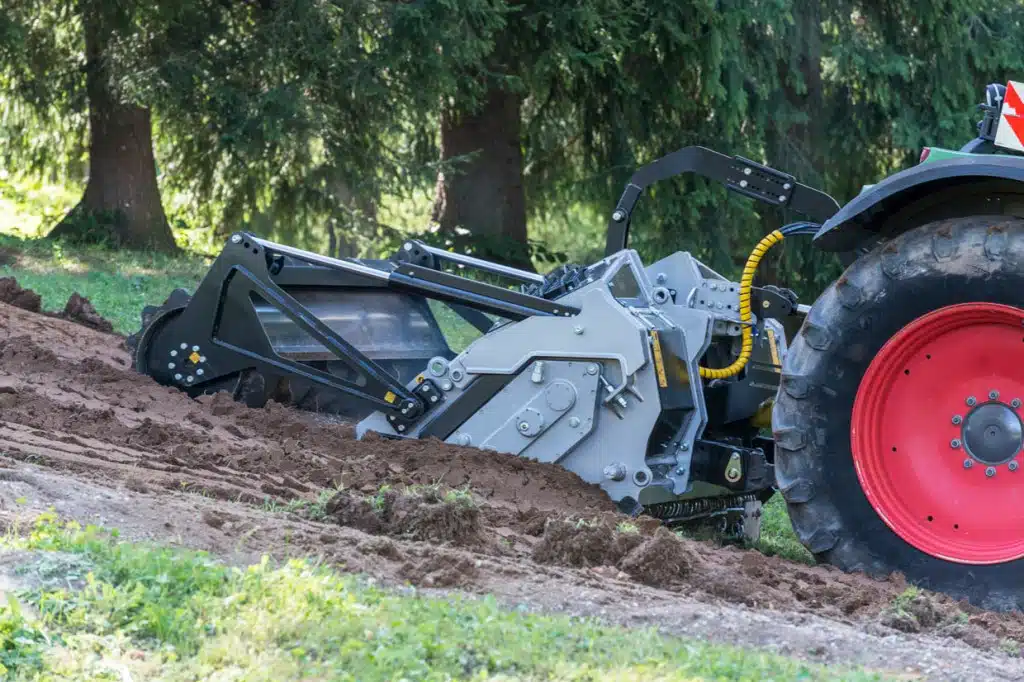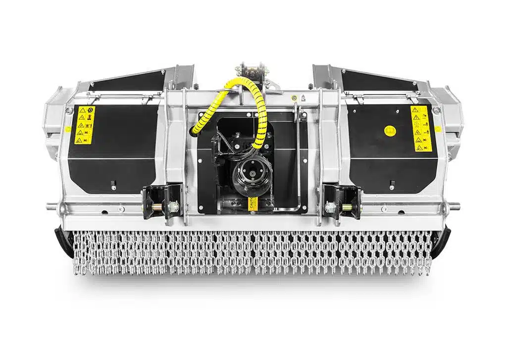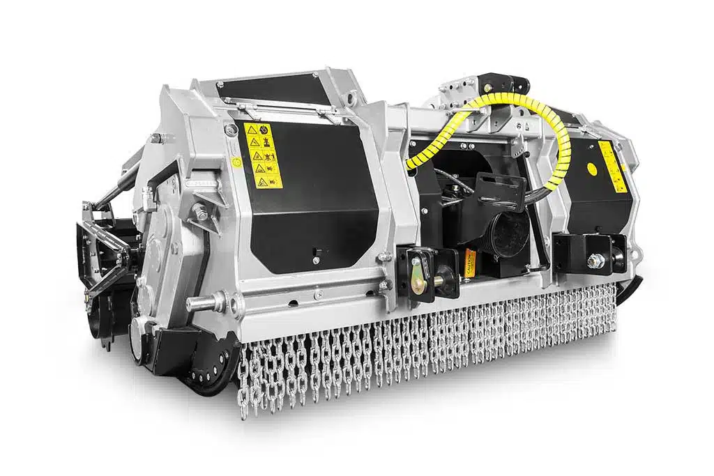 Machine multifonction combinant broyeur de pierres, broyeur de souches et broyeur forestier, équipée d’un rotor à marteaux fixes.